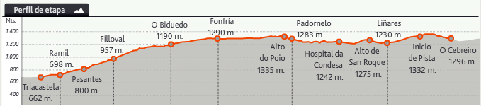 Atravesamos Fonfría y de nuevo, junto a la inseparable LU-633, regresamos a la senda que nos lleva por idéntico paisaje hasta O Biduedo, a 2,4 kilómetros de distancia. En todo este tramo descendemos exactamente cien metros (Km 14,3). Tras O Biduedo, ya del Concello de Triacastela, el descenso comienza a hacerse patente. Nos separan tan sólo 6,8 kilómetros del final de etapa y aún debemos bajar unos 530 metros de altitud.